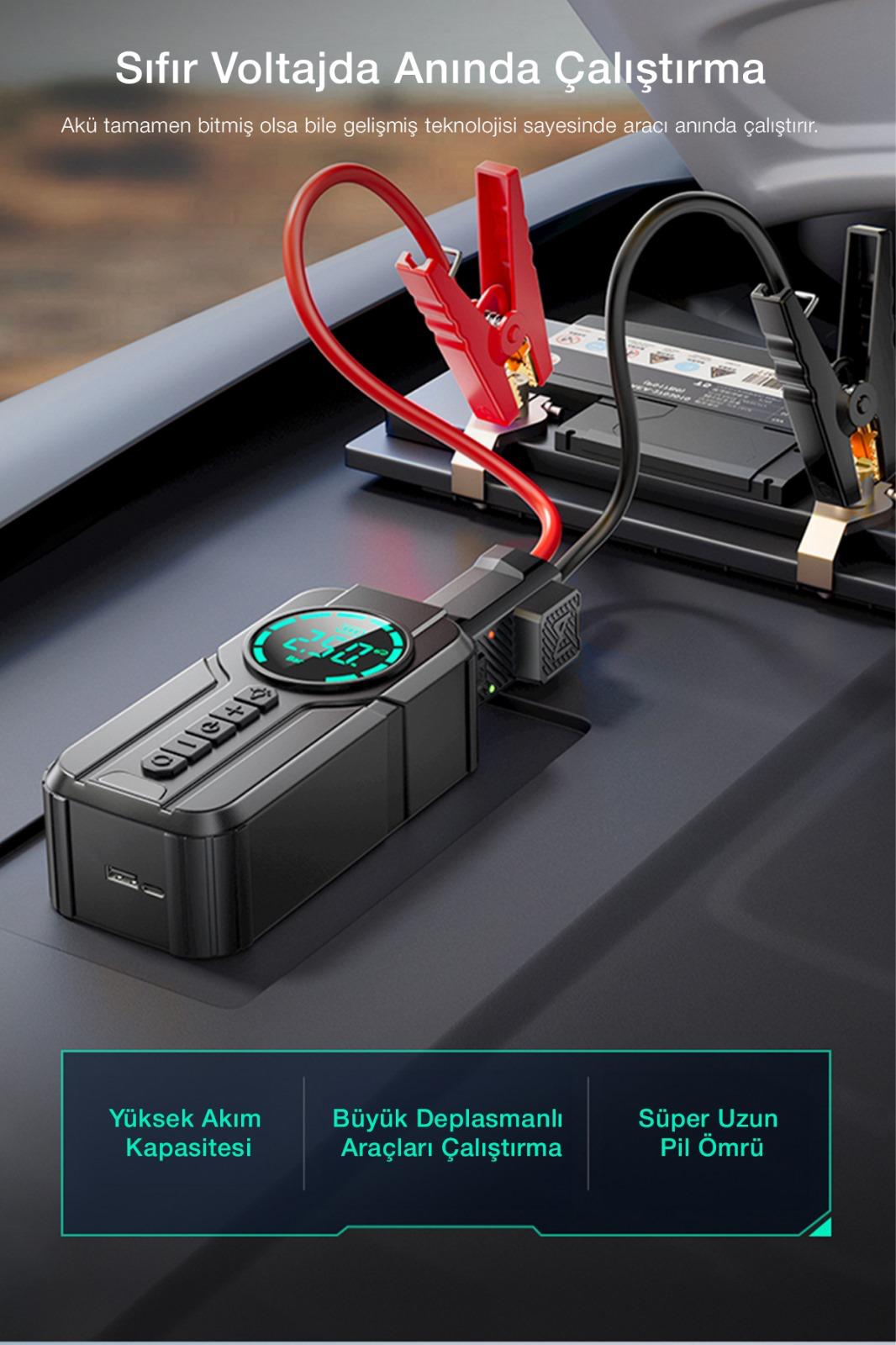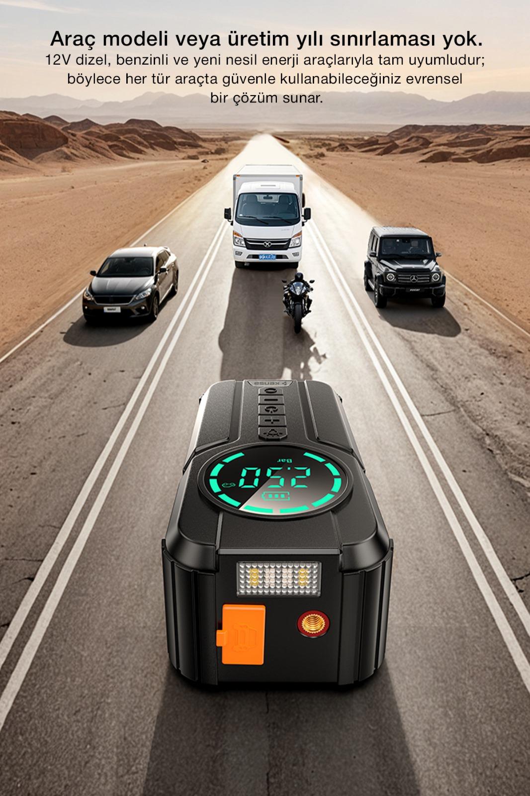3'ü 1 Arada Mega Set: 10.000 mAh Powerbank + Araç Akü Takviye + Dijital Hava Pompası