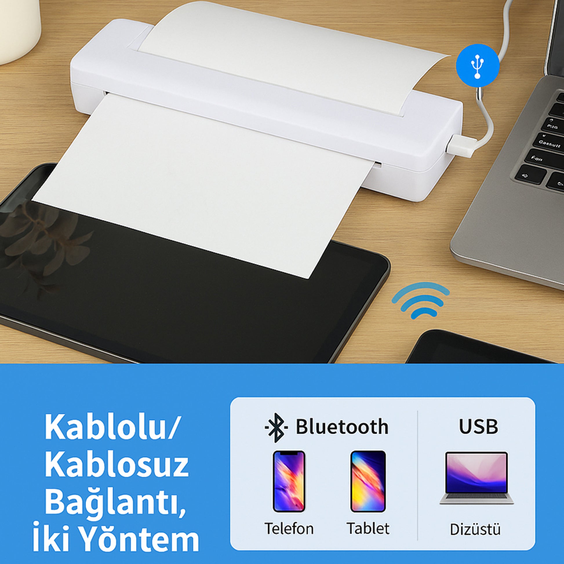 🔋 Bluetooth bağlantısı sayesinde kablosuz kullanım sunar. Priz aramadan her yerde baskı alabilir, özgürlüğünü kısıtlamaz.